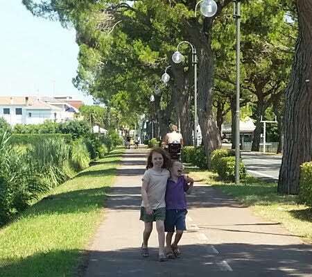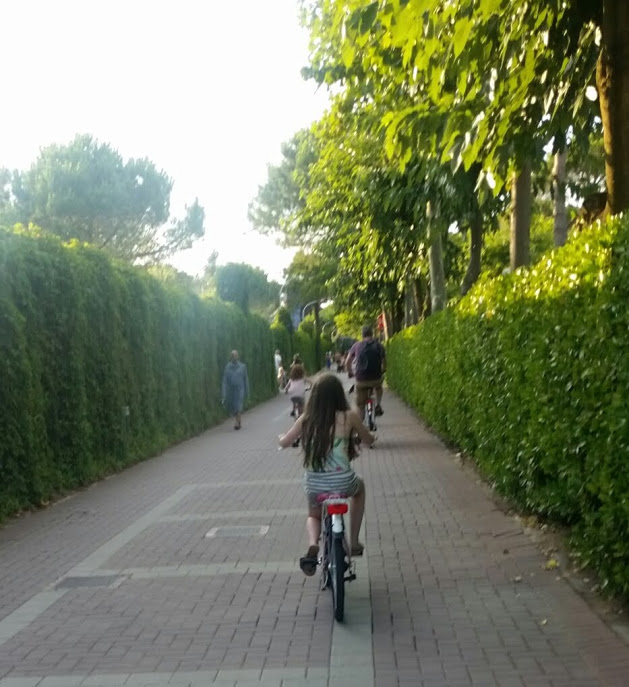 There is a Camping Market directly across the road from the main entrance to the campsite and you can hire bikes there, however when we arrived at 12:30, they had just closed for siesta and weren’t opening again until late in the afternoon. So on the advice of some kind Northern Irish people who were passing by, we walked to the local town, Cavallino, to go to a bike rental shop that’s open all day, and is also by all accounts cheaper. We paid €90 for five bikes for four days.